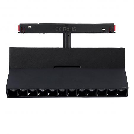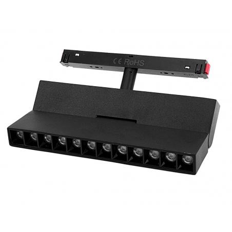 Lampa magnetyczna soczewkowa z przegubem wyposażona w adapter magnetyczny do łatwego montażu zarówno w szynach natynkowych jak i podtynkowych. Lampa o mocy 12W. Temperatura światła białego - 3000K (barwa ciepła) lub 4000K (barwa neutralna). Kąt świecenia 105°. Urządzenie wykonane z aluminium, dostępne w czarnej wersji kolorystycznej.